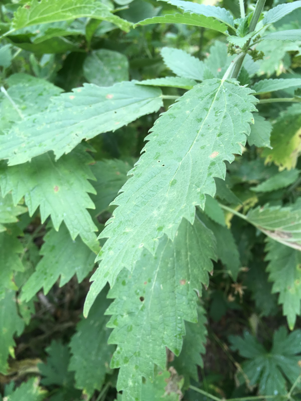 Thomas zapped by stinging nettle. We all got some stings and learned a lot about the plant after looking it up.